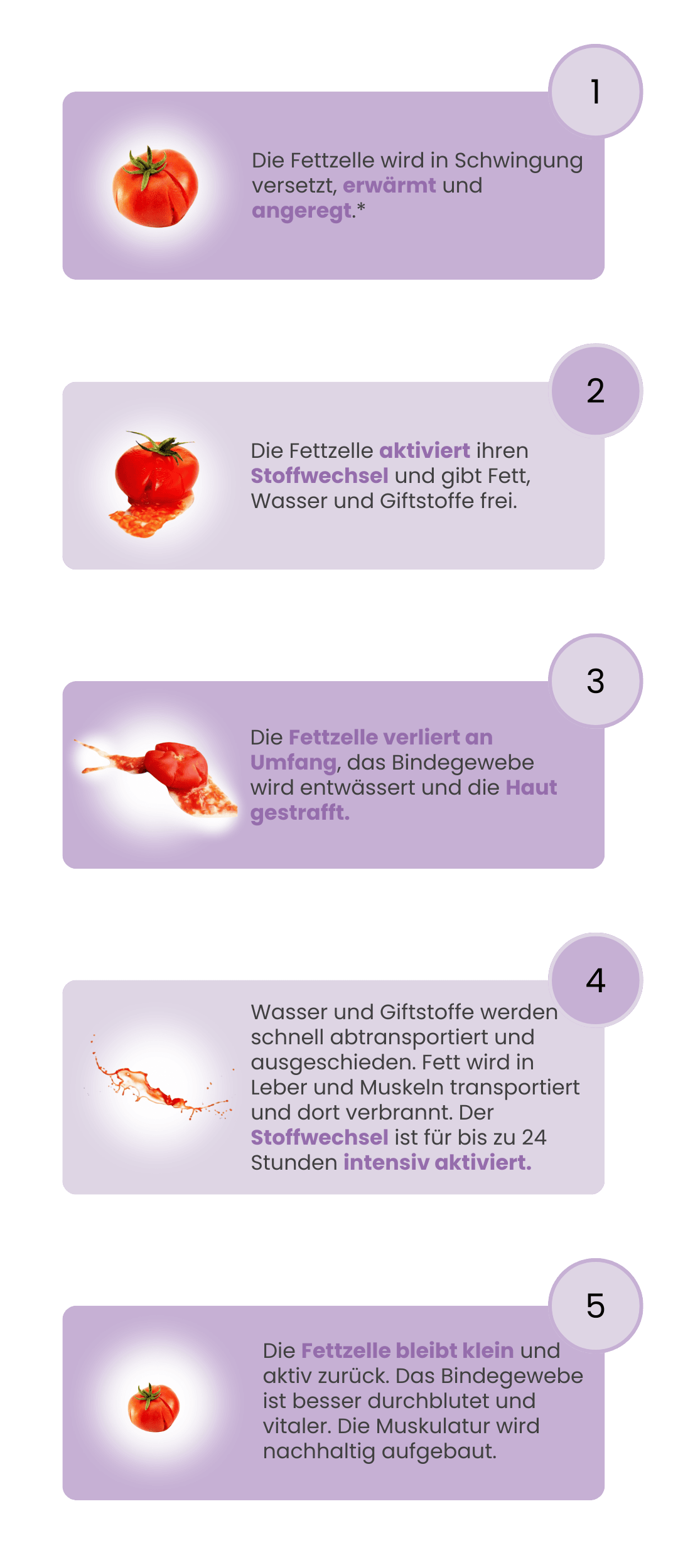 *Achtung! Die Fettzelle wird weder verletzt noch zerstört. Lediglich der Stoffwechsel der Fettzelle wird "aufgeweckt", damit der natürliche Fettabbau wieder ablaufen kann. Die Darstellung der Fettzelle dient ausschließlich der einfachen bildlichen Veranschaulichung. Eine Gewichtsreduktion auf der Waage setzt eine dafür geeignete Ernährung voraus.